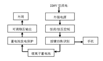 從手機(jī)鋰離子二次電池的恒流/恒壓充電控制出發(fā),用220V交流電通過配置的內(nèi)置儲(chǔ)能鋰電池對(duì)手機(jī)鋰離子電池充電。電路的具體工作流程如圖1所示。