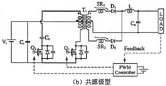 伴隨著開關(guān)電源開關(guān)操作時(shí)急劇的電壓和電流變化而產(chǎn)生的浪涌和噪聲將作為傳導(dǎo)噪聲或輻射噪聲傳遞至設(shè)備的外部,從而引發(fā)電磁干擾(EMI)問題。傳導(dǎo)噪聲(特別是共模噪聲)中也時(shí)常會(huì)產(chǎn)生很大的環(huán)路電流,這是輻射噪聲的起因。近幾年來,ZVS(零電壓開關(guān))和ZCS(零電流開關(guān))等軟開關(guān)(SoftSwitching)技術(shù)作為抑制浪涌發(fā)生的常規(guī)方法已經(jīng)廣為人知。不過,人們?cè)诖嘶A(chǔ)上又提出了多種能夠兼顧低功耗和低噪聲目標(biāo)的電路方案。圖5(a)示出了采用有源鉗位電路的傳統(tǒng)型轉(zhuǎn)換器電路。鉗位開關(guān)Q2需要在高壓側(cè)進(jìn)行絕緣驅(qū)動(dòng),這里通常采用的是脈沖變壓器。然而,如圖5(b)所示,研究人員最近又提出了一種共源極型有源鉗位電路方案,它將兩個(gè)MOSFET開關(guān)的源極端子共接,從而簡(jiǎn)化了柵極驅(qū)動(dòng)。不僅如此,這種共源極型電路方式還有望降低噪聲,經(jīng)實(shí)驗(yàn)測(cè)量,其噪聲電平較之傳統(tǒng)型電路下降了約30dB。