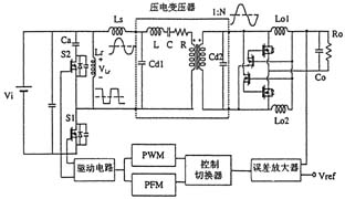 日本的研究人員開發(fā)成功一種振動(dòng)型壓電變壓器,其厚度僅為4mm。該壓電變壓器的驅(qū)動(dòng)電路采用方波逆變器,通過改變其開關(guān)頻率(PFM方式)以達(dá)到借助壓電變壓器的諧振特性來調(diào)整輸出電壓的目的。但是,由于壓電變壓器具有多種由其形狀所決定的諧振頻率,所以很難通過大幅度地改變頻率的做法來控制輸出電壓。為此,人們正在研究引入逆變器的脈寬調(diào)制(PWM)技術(shù)。圖7示出了通過將驅(qū)動(dòng)用逆變器、采用電流倍增器的整流電路以及采用PFM和PWM方式的混合控制電路與壓電變壓器相連而構(gòu)成的壓電變壓器DC/DC轉(zhuǎn)換器。