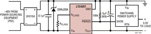 圖1b:采用LTC4257實現(xiàn)的符合基本802.3af標準的PD電路。