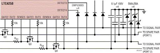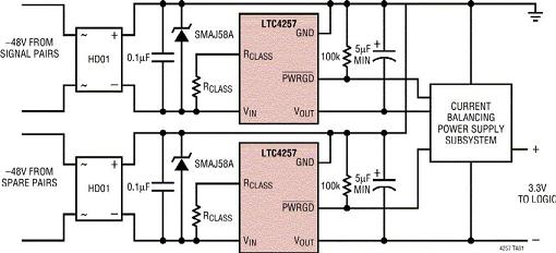 四對PD電路是最大的變化(圖4b)。現(xiàn)在需要采用兩個LTC4257器件,電源電路必須具備足夠的智能,以便把從每一個通道吸取的電流限制在802.3af規(guī)范容許的范圍之內。要做到這一點,就要平衡從每一對線吸取的電流或平衡從每一對線吸取的功率,直到它接近(但是不超過)ICUT極限,然后,才從其它線對吸取電流。這種電路可能相當復雜,不同的設計之間差異也很大。