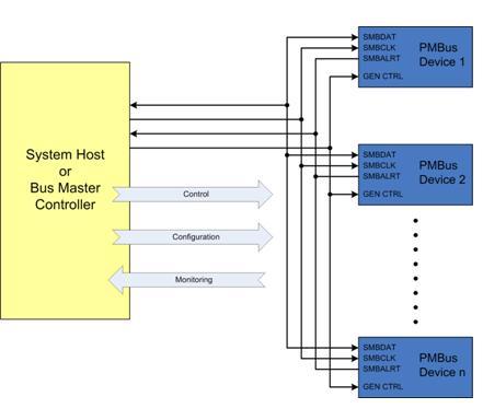 系統(tǒng)主機可以是安裝于印刷電路板(PCB)上作為電源管理總線裝置的實體裝置,如現(xiàn)場可編程門陣列(FPGA),微處理器或通用的微控制器,也可以是處于系統(tǒng)外部的控制實體,如自動檢驗設(shè)備,甚至可以是臺式電腦中的控制軟件。能夠用于系統(tǒng)管理總線通信的任何物體均可用作電源管理總線系統(tǒng)的界面。