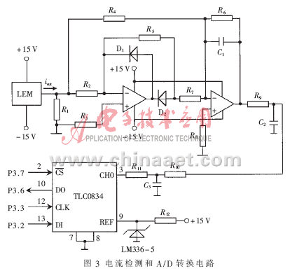 軟起動(dòng)的主要任務(wù)是控制主電路的電流,因此要對(duì)電流進(jìn)行檢測(cè)和監(jiān)控。電流檢測(cè)和A/D轉(zhuǎn)換電路如圖3所示。本裝置采用LEM電流傳感器進(jìn)行主回路電流的檢測(cè),其主要優(yōu)點(diǎn)是LEM電流傳感器可以測(cè)量任意波形的電流及瞬態(tài)峰值,副邊電流能真實(shí)地反映原邊電流的波形,原邊電路與副邊電路之間完全絕緣,可靠性高,而且動(dòng)態(tài)性能好,精度高,因此能夠很好地滿足工業(yè)現(xiàn)場(chǎng)應(yīng)用的需要。為減小誤差保證轉(zhuǎn)換精度,沒(méi)有采用傳統(tǒng)的橋式二極管整流電路對(duì)LEM模塊輸出的電流進(jìn)行整流,而是采用由2個(gè)運(yùn)放組成的精密全波整流電路進(jìn)行整流并濾波,得到與交流電流成比例變化的0~5V的直流電壓信號(hào)送入A/D轉(zhuǎn)換器TLC0834轉(zhuǎn)換成二進(jìn)制數(shù)送入單片機(jī),以此信號(hào)作為改變晶閘管觸發(fā)角大小的依據(jù),并用于數(shù)碼管顯示。TLC0834是8位串行控制模數(shù)轉(zhuǎn)換器,以5V作為基準(zhǔn)電壓,通過(guò)與控制處理器相連的串行數(shù)據(jù)鏈路傳送控制命令,用軟件對(duì)通道選擇和輸入端進(jìn)行配置。多路器尋址通過(guò)TLC0834的DI端移入轉(zhuǎn)換器。TLC0834的DI、CLK、DO和/CS分別與單片機(jī)的P3.2、P3.3、P3.6和P3.7端口連接。程序中置/CS為低,使TLC0834能夠工作,并對(duì)轉(zhuǎn)換器初始化;然后從處理器接收1個(gè)時(shí)鐘,在每個(gè)時(shí)鐘的上升跳變時(shí),DI端的數(shù)據(jù)移入多路器地址移位寄存器。在轉(zhuǎn)換過(guò)程中,轉(zhuǎn)換數(shù)據(jù)同時(shí)從DO端輸出。這樣TLC0834將輸入電壓轉(zhuǎn)換成二進(jìn)制數(shù)送入單片機(jī)后進(jìn)行處理和顯示。