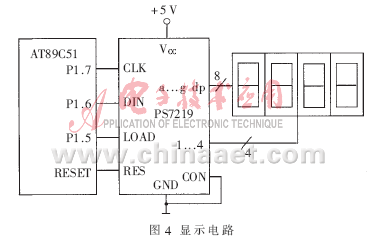 顯示電路如圖4所示,由高性能的多位LED顯示驅(qū)動(dòng)器PS7219控制。PS7219內(nèi)部具有15×8BRAM功能控制器寄存器,尋址方便;其復(fù)位引腳與單片機(jī)的復(fù)位端連接,LOAD、DIN和CLK端分別與單片機(jī)的P1.5、P1.6和P1.7端口連接。LOAD腳的功能是裝載數(shù)據(jù)輸入,當(dāng)它為高電平時(shí),串行輸入數(shù)據(jù)的最后16位被鎖定。串行數(shù)據(jù)的傳送格式為D15~D0,其中D15~D12為無(wú)關(guān)位,D11~D8為寄存器地址,D7~D0為數(shù)據(jù)位;DIN腳的功能是串行數(shù)據(jù)輸入,發(fā)送到DIN端的16位數(shù)據(jù)在每個(gè)CLK的下降沿被移入到內(nèi)部16位寄存器中;然后,在LOAD的上升沿,數(shù)據(jù)被鎖存到數(shù)值或控制寄存器中。