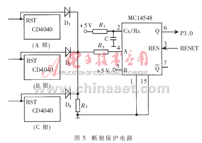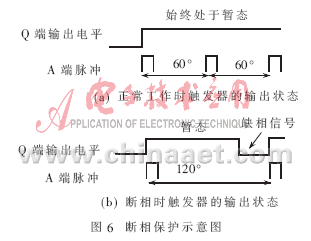 斷相是對(duì)電動(dòng)機(jī)危害較大的一種故障,為此系統(tǒng)單獨(dú)設(shè)置了如圖5所示的斷相保護(hù)電路,主要由摩托羅拉單穩(wěn)態(tài)觸發(fā)器MC14548和3只二極管組成的“或門(mén)”電路實(shí)現(xiàn)。斷相保護(hù)示意圖如圖6所示。MC14548由上升沿觸發(fā),產(chǎn)生1個(gè)脈寬由外加定時(shí)元件電阻R1和電容C決定的輸出脈沖。當(dāng)MC14548的A端出現(xiàn)1個(gè)上升沿、B端為高電平時(shí),Q端(平時(shí)輸出低電平)輸出1個(gè)由低到高的脈沖,經(jīng)過(guò)時(shí)間τ(τ=R1×C)后從高變低。分別來(lái)自A、B、C相觸發(fā)電路中計(jì)數(shù)器CD4040的RST端的3個(gè)信號(hào)經(jīng)“或門(mén)”電路與MC14548的A端相連。因三相電源電壓相位互差120°,故接入A、B、C三相回路的3個(gè)雙光耦TLP521每60°就有1次過(guò)零,過(guò)零時(shí)3個(gè)計(jì)數(shù)器CD4040的RST端一定有1個(gè)呈高電平,經(jīng)過(guò)“或門(mén)”后MC14548的4腳每60°就有1個(gè)上升沿脈沖。若設(shè)定時(shí)間常數(shù)τ的值在大于60°而小于120°所對(duì)應(yīng)的時(shí)間為:3.3ms<τ<6.6ms,則不缺相時(shí),單穩(wěn)態(tài)觸發(fā)器將始終處于暫態(tài),MC14548的Q端始終輸出高電平,此時(shí)觸發(fā)器的工作狀態(tài)如圖6(a)所示;若斷相,MC14548的A端將出現(xiàn)隔120°才出現(xiàn)下一個(gè)脈沖的情況,此時(shí)MC14548的Q端將從暫態(tài)回到穩(wěn)態(tài),呈現(xiàn)低電平,此時(shí)觸發(fā)器的工作狀態(tài)如圖6(b)所示。將MC14548的Q端連至單片機(jī)的P3.0端口,由程序檢查P3.0端口,如為零則說(shuō)明斷相,然后進(jìn)行斷相處理。