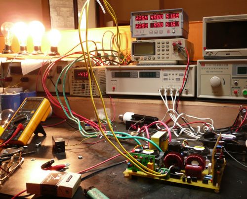先在電瓶的引線上接一個15A的保險絲,功率主板上的高壓保險絲不要裝,這樣,前后級就分開了。插上前級DC-DC驅動板,把萬用表直流電壓700V檔接在高壓電解二端,開機(按一下DC-DC驅動板上的ON啟動開關),前級就啟動了,功率主板上的高壓指示LED就亮了,這時,看直流高壓為幾V。調試DC-DC驅動板上的R12多圈電位器,使高壓輸出在370-380V之間。此時,12V的電流應該在200MA之內,說明前級正常。這里如果看D極波形,應該是雜亂的波形,因為是空載限壓的狀態(tài)下,這樣的波形是對的。