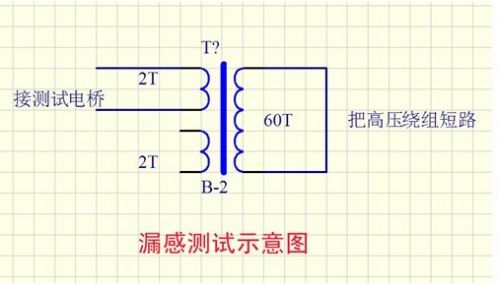 我發(fā)現用這種方法繞制的變壓器漏感比較小。以前用銅帶繞制,漏感一般在0.8uH以上,現在可以做到0.4uH以下。我想原因是:因為銅帶要焊引出線頭,這樣就留下了一個錫堆,再繞高壓繞組時,中間就有一個空隙,導致耦合不緊。下圖為測試漏感示意圖。