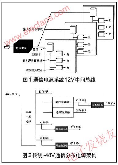 [page]圖2示出dc-dc隔離電流模塊和POL負(fù)載點變換器如何配置成典型的分布電源系統(tǒng),提供多輸出電壓和電流。來自前端ac-dc電源的DC電壓(-36~-72V)饋入一個隔離的電源模塊,此模塊代表一個總線變換器。模塊完全是隔離ac-dc變換器,有不同的形式(全磚、半磚、1/4磚),具有標(biāo)準(zhǔn)的占位面積,引腳輸出和散熱能力。POL變換器可以是開關(guān)穩(wěn)壓器(降壓或升壓穩(wěn)壓器)和線性穩(wěn)壓器的組合或僅是線性穩(wěn)壓器,這取決于所供電的電路要求。靈敏電路需要低噪聲線性穩(wěn)壓器,而高效率開關(guān)穩(wěn)壓器是必須有最小功耗的電源系統(tǒng)的選擇。