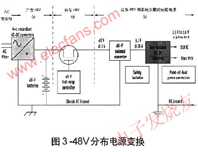 圖3示出電信應(yīng)用的-48V分布電源系統(tǒng)框圖,該圖說明了電源從輸入ac線到低電壓dc-dcPOL變換器的過程,電池(48V)為電源失效時備份ac-dc變換器。-48V熱交換控制器(IC)在帶電插撥電路板時,為電源連接提供智能控制,這包括侵入電流控制,短路保護(hù)和保護(hù)電源系統(tǒng)的其他保護(hù)功能。第一個dc-dc變換級是一個隔離變換器,這意味著輸入dc電源地與輸出ac電源地是隔離的,通常采用變換器隔離,隔離是限定的,防止在失效條件下所呈現(xiàn)危險電壓電平危害人。然而,隔離電路使變換器比較貴并對效率有影響。為系統(tǒng)單元電路提供電源的POL變換器不需要隔離,因為它們由為其提供dc輸入電源的隔離電源模塊保護(hù)。