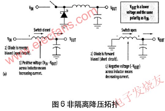 降壓變換器是構(gòu)成大多數(shù)開關(guān)變換器架構(gòu)基礎(chǔ)的基本拓?fù)洹K亲钔ㄓ玫耐負(fù)?,在分布電源系統(tǒng)中會用到這種拓?fù)洌驗楸仨氉儞Q高dc電壓(48V)到較低的電壓,而且功耗小。開關(guān)是一個功率晶體管(通常是MOSFET),其柵極由執(zhí)行脈寬調(diào)制(PWM)的IC驅(qū)動它控制占空比(晶體管的開關(guān)時間),從而控制輸出電壓大小。圖6示出非隔離降壓拓?fù)洹?br />