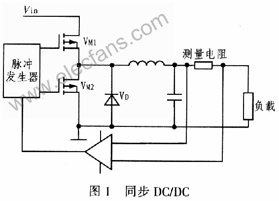 [page]Vin為輸入電壓,VM1、VM2為MOSFET,VM1導(dǎo)通寬度決定輸出電壓大小,快恢復(fù)二極管和VM2共同續(xù)流電路,整流管的導(dǎo)通損耗占據(jù)最主要的部分,因此它的選擇至關(guān)重要,試驗(yàn)中選用通態(tài)電阻很低的M0SFET。電感、電容組成濾波電路。測量電阻兩端電壓與給定值比較后,通過脈沖發(fā)生器產(chǎn)生相應(yīng)的脈寬,保持負(fù)載電流穩(wěn)定。VM1關(guān)斷,快恢復(fù)二極管工作,快恢復(fù)二極管通態(tài)損耗大,VM2接著開通續(xù)流,減少系統(tǒng)損耗。