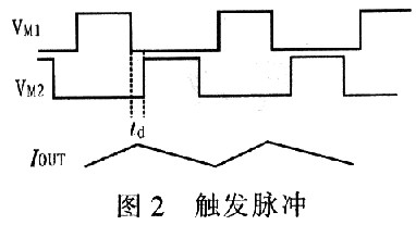 ;VM1關(guān)斷,電流通過VD續(xù)流,接著VN2導(dǎo)通。由于VM2的阻抗遠(yuǎn)小于二極管阻抗,因此通過VM2續(xù)流。VMl、VN2觸發(fā)脈沖如圖2所示。圖2中td為續(xù)流二極管導(dǎo)通時(shí)間。