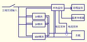大功率電動汽車充電機的輸入為額定線電壓380V、50Hz的三相交流電,輸出額定電壓700V,額定電流600A。系統采用19"標準機架,結構緊湊、布局合理、外型美觀大方。外型尺寸:高×寬×深為2200mm×600mm×600mm。采用60個模塊并聯,每個模塊10A/700V,模塊尺寸:高×寬×深為133mm×425mm×270mm,15層4列,分四個柜體安放,四個柜體可分開運輸,使用時緊湊左右排列。機架前門、后門均為雙開門,方便檢修。電源進線和匯流排輸出位置均在底部輸入。電源輸入斷路器及監(jiān)控單元觸摸屏安裝在主機中間控制柜前部。充電機控制結構示意圖如圖2所示。
