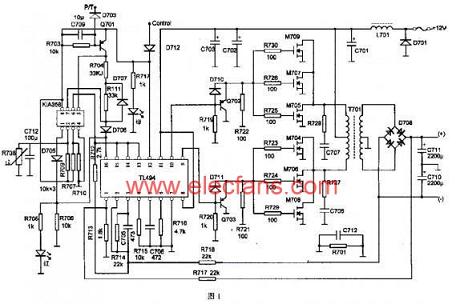 運(yùn)放A1作為過流保護(hù)用,6腳由TL494的14腳提供5V參考電壓。正常情況下,P/T端為高電平,5腳為低電平,所以7腳輸出低電平,TL494的16腳也為低電平。當(dāng)由于運(yùn)放出現(xiàn)過流或其它原因而使P/T端檢測到低電平時,5腳為高電平,且高于6腳參考電平,7腳便輸出高電平,保護(hù)動作。運(yùn)放A2作為開機(jī)保護(hù)和過熱保護(hù)用,同相輸入端3腳電壓由控制電壓12V經(jīng)兩電阻R707和R709分壓獲得。反相輸入端電壓由R710和熱敏電阻R708分壓獲得。R708在常溫下阻值為100kΩ左右,2腳電平高于3腳電平,1腳便輸出低電平。當(dāng)溫度升高到近100℃時,熱敏電阻阻值降為低于10kΩ。2腳電平低于3腳電平,輸出翻轉(zhuǎn),保護(hù)動作,紅色發(fā)光二極管亮。電容C712作為開機(jī)保護(hù)用,開機(jī)瞬間C712充電,而使2腳電平低于3腳電平,這時保護(hù)動作,紅色發(fā)光二極管亮。