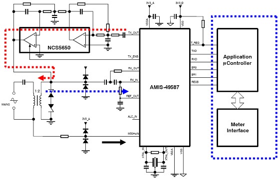 藍(lán)色箭頭表示接收路徑。變壓器從電力線耦合過來的信號經(jīng)AMIS-49587內(nèi)置放大器構(gòu)成的低通濾波器由內(nèi)部ARM進(jìn)行FSK解調(diào)分析。圖中黑色箭頭是50Hz的過零檢測信號引腳。系統(tǒng)依靠這個信號進(jìn)行同步定時。圖中藍(lán)色虛線內(nèi)是電表內(nèi)的應(yīng)用處理器,負(fù)責(zé)應(yīng)用層處理通信及計量?! ?br />