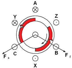 得知Hall輸出信號與轉(zhuǎn)子磁動(dòng)勢位置的關(guān)系之后,可以產(chǎn)生正六邊形的旋轉(zhuǎn)磁場,如圖4所示,AB相繞組通電,產(chǎn)生圖中合成磁勢Fa,由于Fa的牽引,F(xiàn)f將會(huì)順時(shí)針旋轉(zhuǎn),旋轉(zhuǎn)到X位置后,換成給AC相通電,則Fa順時(shí)針跳躍60°電角度,牽引Ff順時(shí)針旋轉(zhuǎn)60°,依次類推,通電順序按照AB-AC-BC-BA-CA-CB-AB循環(huán),則帶動(dòng)永磁轉(zhuǎn)子順時(shí)針旋轉(zhuǎn)。這就是傳統(tǒng)的方波控制方式。