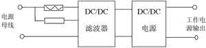 電源控制器中控制模塊使用的工作電源取自一次電源母線,工作電源有兩個(gè)模塊并聯(lián)組成。當(dāng)其中一個(gè)工作電源模塊發(fā)生故障時(shí),即自動(dòng)退出供電回路,由另一個(gè)工作電源模塊完成供電,保證控制電路的用電,電路故障則通過(guò)隔離二極管來(lái)隔離。