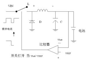 快速調(diào)節(jié)器的操作是通過控制一個晶體管開關(guān)的占空比來實(shí)現(xiàn)的。占空比會自動增加以使電池流入更多的電流。當(dāng)VBATT<VREF時,一個比較器會將開關(guān)閉合(參見圖5a),電流流入電池和電容C,這個電流同時也存儲在電感L中。VBATT持續(xù)升高,直到超過VREF,調(diào)節(jié)此時比較器將開關(guān)斷開(參見圖5b),存儲在電感中的電流迅速下降直到二極管偏置,使得電感電流以減速度流入電池,電容C在電感電流衰減后開始放電。并且最后VBATT開始下降,當(dāng)VBATT低于VREF時,比較器再次將開關(guān)閉合并開始另一次循環(huán)。在較大的范圍內(nèi)如果減小占空縮短閉合的時間,平均電壓就會下降,反之亦然。因此可以通過控制占空比的方法調(diào)節(jié)電壓或電流至所需要的值。