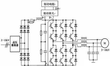 圖2.具有直流放電制動裝置的IGBT直接串聯(lián)高壓變頻器主電路圖