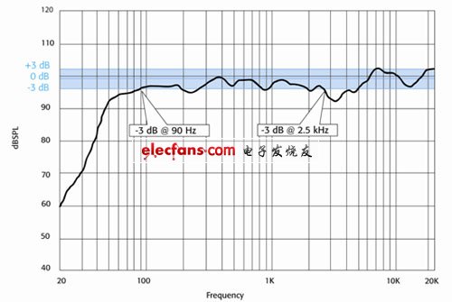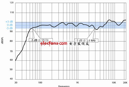 如果說(shuō)+/-3dB所表示的是平坦特性,而不是頻率響應(yīng)范圍,那么這個(gè)參數(shù)對(duì)頻率特性而言還有什么意義?回答這個(gè)問(wèn)題前我們可以看一下制造商在典型揚(yáng)聲器說(shuō)明書上所標(biāo)注的“+/-3dB頻響。”