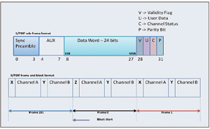 S/PDIF幀格式——首先驅動數(shù)據(jù)的最低有效位。每個幀有兩個子幀,分別是32個時隙,共64個時隙(見圖2)。子幀以一個前導碼開始,后面跟隨24位數(shù)據(jù),最后以攜帶用戶數(shù)據(jù)和通道狀態(tài)等信息的4位結束。子幀的前4個時隙稱為前導碼,用于指示子幀和塊的開始。前導碼有三個,每一前導碼均包含一個或兩個持續(xù)時間為3UI的脈沖,從而打破雙相編碼規(guī)則。這意味著,該模式不可能存在于數(shù)據(jù)流中的其他地方。每個子幀都以4位前導碼開始。塊的開始用前導碼“Z”和子幀通道的開始“A”表示。前導碼“X”表示通道“A”子幀的開始(不同于塊的開始),前導碼“Y”表示通道“B”子幀的開始。