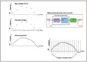 SRC利用輸出采樣速率極高的插值濾波器和零階保持器(ZOH)將離散時間信號轉換為連續(xù)時間信號。插值值被饋送至ZOH,并以Fsout的輸出采樣頻率進行異步采樣。