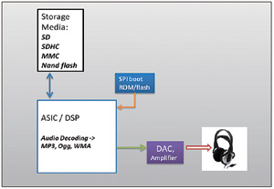 便攜式音頻系統(tǒng)——有些手持式音頻系統(tǒng)采用ASIC,有些則采用DSP。MP3、Ogg和其他媒體文件等音頻內容通常存儲在高密度存儲設備中,如NAND閃存、安全數(shù)字(SD)卡、多媒體卡(MMC)和安全數(shù)字高容量卡(SDHC)等。