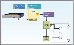 利用多聲道、多揚聲器系統(tǒng)和先進的音頻算法,音頻系統(tǒng)能夠惟妙惟肖地模擬真實聲音。這些復雜的音頻系統(tǒng)使用ASIC或DSP來解碼多聲道編碼音頻,并且運行各種后處理算法。聲道數(shù)量越多,意味著存儲器和帶寬要求越高,這就需要使用音頻數(shù)據(jù)壓縮技術來編碼并減少所要存儲的數(shù)據(jù)。這些技術還能用來保持聲音質量。