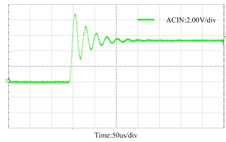 而在適配器熱插拔時(shí),也會出現(xiàn)瞬態(tài)的過壓電壓,由于適配器連接線的寄生電感效應(yīng),熱插拔時(shí)會產(chǎn)生瞬態(tài)的輸出振蕩波形,經(jīng)過一段時(shí)間的衰減后會穩(wěn)定在DC值。圖2為5.5V適配器熱插拔時(shí)的瞬態(tài)波形,通常適配器熱插拔時(shí)產(chǎn)生的瞬態(tài)過壓峰值電壓是其DC值的兩倍左右。