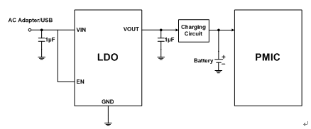 但在標(biāo)準(zhǔn)的諾基亞適配器中,有很大一部分適配器的輸出電壓是高于7V的,圖3是諾基亞適配器AC-3C的輸出特性曲線,從圖中可以看出,AC-3C的輸出電壓在空載時(shí)為7.5V,而有的諾基亞充電器的輸出電壓會高達(dá)8~9V。為了適應(yīng)諾基亞適配器,曾有如圖5所示的用高壓LDO設(shè)計(jì)的手機(jī)充電系統(tǒng)方案: