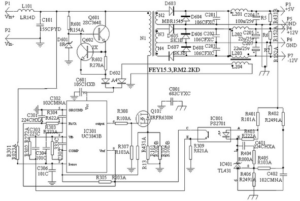 電源工作原理為:電路采用單端正激變換電路,當(dāng)變換器接通電源時,輸入直流電壓經(jīng)由電阻、12V穩(wěn)壓管D601和三極管Q601、Q602組成的電路穩(wěn)壓降壓后, 啟動UC3843進入正常工作,偏置繞組L204的供電電路開始工作,輸出經(jīng)A4和C601整流及濾波后輸出12V電壓,高于自供電電壓,使二極管A4反偏,啟動電路停止工作。變換器進入正常工作后,電源依據(jù)PWM脈寬調(diào)制方式工作,次級繞組的輸出經(jīng)過二極管整流以及電容器和電感器組成的LC型濾波器濾波后,產(chǎn)生所需的各路輸出直流電壓。+5V的輸出電壓由電阻器R402和R406分壓后,與可編程穩(wěn)壓源TL431(U3)中的2.5V參考電壓比較,然后通過光耦合器U2反饋到UC3843的2腳,控制脈沖的占空比,穩(wěn)定5V輸出。耦合電感L202和L203實現(xiàn)+/-12V兩路穩(wěn)壓。過流保護電阻R101、R102檢測到開關(guān)管的過流信號,送入3843的3腳,封鎖UC3843的輸出信號,實現(xiàn)過流保護。