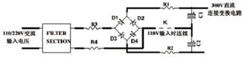 浪涌電流的抑制方法有很多,一般中小功率電源中采用電阻限流的辦法抑制開(kāi)機(jī)浪涌電流。圖2是一個(gè)常見(jiàn)的110V/220V雙輸入電源示意圖,以此為例,我們分析一下如何使用NTC熱敏電阻進(jìn)行浪涌電流的抑制。
