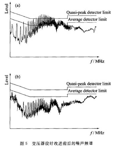圖5為變壓器設計改進前后實驗樣品的傳導噪聲頻譜對比。