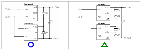 圖2-2為兩個(gè)雙路輸出電源模塊串聯(lián)接線方式,因此,可得到四組Vout相加后的輸出電壓。單一個(gè)雙路輸出電源模塊,其兩組輸出之啟動(dòng)時(shí)間是一致的,故僅需在+/-Vo1及+/-Vo2各并上二極管即可,如圖左所示。在上圖中,輸出端共并上4顆二極管,此方式亦可行,但較浪費(fèi)成本。串聯(lián)后的輸出電壓,可再加上輸出電容,用以降低因兩電源模塊差頻所造成的Ripple & Noise。