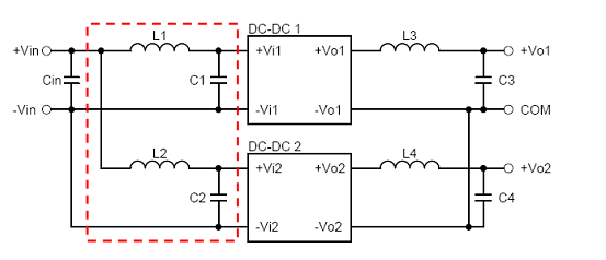 在一電源系統(tǒng)中,若同時(shí)使用多組電源模塊,且輸入端使用同一電源時(shí),為防止二組或多組電源模塊之間的交互干擾,形成系統(tǒng)所不樂見的EMI問題,甚至造成系統(tǒng)誤動(dòng)作的諧波,此時(shí),可在電源系統(tǒng)前端與EMI filter之間加入L1、C1、L2與C2來減低電源模塊之間的交互干擾。