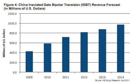 隨著中國高鐵、地鐵、動(dòng)車、風(fēng)力發(fā)電、光伏發(fā)電、電動(dòng)/混合動(dòng)力汽車等領(lǐng)域的快速發(fā)展,市場對IGBT及其模塊的需求越來越大。據(jù)IHS iSuppli公司的研究,由于工業(yè)與消費(fèi)領(lǐng)域的需求增長,中國絕緣柵雙極型晶體管(IGBT)市場未來幾年將快速增長,2014年銷售額將從2009年的4.297億美元上升到9.75億美元,增長一倍以上。