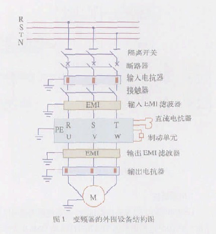 變頻器外圍保護設(shè)備的組成為了提高變頻器的工作性能,實現(xiàn)變頻器和電動機的保護,減少變頻器和周圍其他電氣設(shè)備的相互影響,在變頻器的輸入、輸出端配備的外圍保護設(shè)備如圖1 所示。