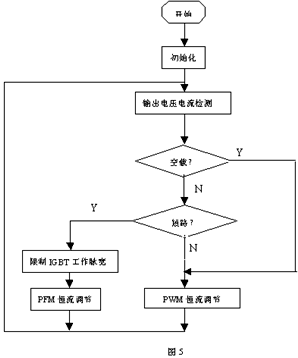 在此硬件電路的基礎(chǔ)上,結(jié)合單片機的控制系統(tǒng)可檢測輸出電壓低于某一設(shè)定值時,單片機便認(rèn)為負(fù)載電弧是處于短路狀態(tài),這時單片機便對IGBT的最小脈沖寬度進(jìn)行限制,以保證吸收電容有足夠的放電時間,從而降低IGBT的關(guān)斷反向電壓。同時為保證輸出電流恒定,單片機在判斷輸出為短路時將逆變器的等脈沖寬度調(diào)節(jié)(PWM)變?yōu)轭l率調(diào)節(jié)控制(PFM),即脈沖分頻控制,輸出電壓越低,輸出脈沖的頻率越低。其單片機程序過程如圖5所示:
