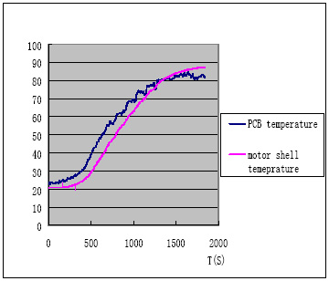 用上文所述的PPTC設(shè)計(jì)流程可以用在多功能豆?jié){機(jī)馬達(dá)防堵保護(hù)設(shè)計(jì)中,但這是往往會(huì)碰到選擇PPTC型號(hào)困難的問(wèn)題,也就是說(shuō)多功能豆?jié){機(jī)的馬達(dá)保護(hù)設(shè)計(jì)會(huì)較普通的小家電馬達(dá)保護(hù)復(fù)雜的多,圖4為磨制豆?jié){時(shí)PCB板周圍環(huán)境溫度和馬達(dá)外殼溫度的實(shí)測(cè)圖,可見(jiàn)控制電路PCB板PPTC周圍的環(huán)境溫度最高可以到達(dá)85C。由于豆?jié){機(jī)的PPTC最高環(huán)境溫度85度會(huì)比普通的小家電最高環(huán)境溫度要求高,這樣既要在85度的最大工作電流下能正常工作,還要保證在最低溫度0度的堵轉(zhuǎn)電流情況下能及時(shí)的保護(hù),相應(yīng)的就增大了設(shè)計(jì)難度。下面就具體的闡述此類多功能豆?jié){機(jī)馬達(dá)堵轉(zhuǎn)的保護(hù)設(shè)計(jì)方案。