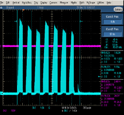 可見(jiàn)LVR100的典型值組件在0C/25C溫度下馬達(dá)保護(hù)時(shí)間還會(huì)更快,完全滿足小于150S的馬達(dá)保護(hù)要求。圖7為在25度下馬達(dá)堵轉(zhuǎn)保護(hù)的實(shí)測(cè)波形。