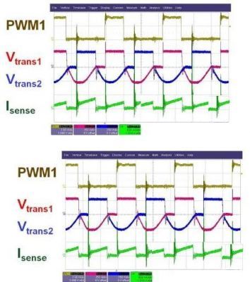 圖4. 兩相均流控制的效果:(上圖)啟用均流控制;(下圖)禁用均流控制。