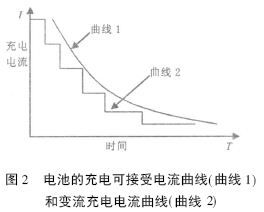 鋰離子電池可接受的充電電流隨充電時間呈指數(shù)規(guī)律下降, 若充電電流曲線在電池可接受充電電流曲線(圖2中曲線1) 以上會導致電池電解液發(fā)生析氣反應, 影響電池壽命.