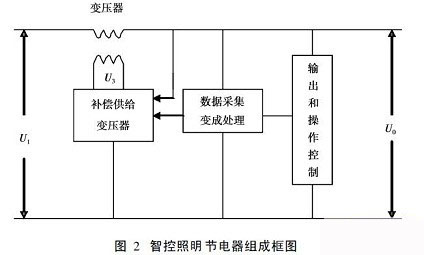 智控照明節(jié)電器組成框圖中的U1為市電輸入電壓,U2為主變壓器副邊電壓,U3為補(bǔ)償供給變壓器的輸出電壓(也是主變壓器的輸入電壓,或叫主變壓器的原邊電壓),U0為節(jié)電器的輸出電壓。