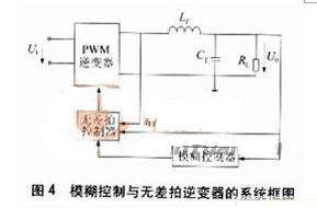 將輸出電壓和濾波電感電流反饋,即電壓誤差和電感電流作為輸入模糊變量,可以實現(xiàn)逆變器的模糊控制,整流性負(fù)載時,其輸出電壓總諧波失真(total harmonic distortion,TH)小于5%,將模糊控制與無差拍控制相結(jié)合,可用來補(bǔ)償由于非線性負(fù)載導(dǎo)致的電壓降落,其系統(tǒng)如圖4所示。模糊控制從模仿人的思維外特性入手,模仿人的模糊信息處理能力。它對系統(tǒng)的控制是以人的經(jīng)驗為依據(jù)的,而人的經(jīng)驗正是反映人在思維過程中的判斷、推理、歸納。理論上已經(jīng)證明,模糊控制可以任意精度逼近任何線性函數(shù),但受到當(dāng)前技術(shù)水平的限制,模糊變量的分檔和模糊規(guī)則都受到一定的限制,隸屬函數(shù)的確定還沒有統(tǒng)一的理論指導(dǎo),帶有一定的人為因素,因此,模糊控制的精度有待于進(jìn)一步提高。