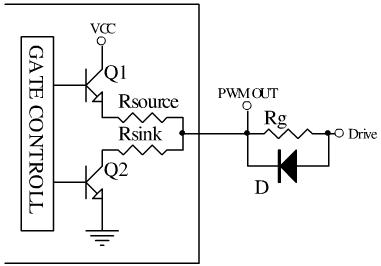 一般IC的PWM OUT輸出如左圖所示,內(nèi)部集成了限流電阻Rsource和Rsink,通常Rsource>Rsink,具體數(shù)值大小同IC的峰值驅(qū)動輸出能力有關(guān),可以近似認(rèn)為R=Vcc/Ipeak。一般IC的驅(qū)動輸出能力在0.5A左右,因此Rsource在20Ω左右。