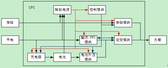從單個(gè)UPS的設(shè)計(jì)來(lái)說(shuō),可以把整個(gè)產(chǎn)品按照模塊進(jìn)行劃分,下面圖中是一個(gè)典型的UPS系統(tǒng)結(jié)構(gòu)圖