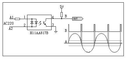 過(guò)零點(diǎn)檢測(cè)可采用硬件實(shí)現(xiàn),在硬件設(shè)計(jì)中,可以增加如圖4 或圖5過(guò)零點(diǎn)的硬件檢測(cè)電路,通過(guò)在B端輸出為高電平時(shí)進(jìn)行按鍵狀態(tài)的判斷,以期在電磁輻射最小的時(shí)候?qū)τ|摸按鍵進(jìn)行檢測(cè)。