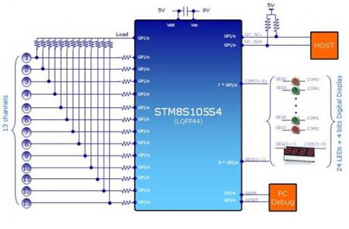 電磁爐是采用磁場(chǎng)感應(yīng)電流的加熱原理對(duì)食物進(jìn)行加熱。加熱時(shí),通過(guò)面板下方的線圈產(chǎn)生強(qiáng)磁場(chǎng),磁力線穿過(guò)導(dǎo)磁體做的鍋的底部時(shí),鍋具切割交變磁力線而在鍋具底部產(chǎn)生渦流使鍋底迅速發(fā)熱,達(dá)到加熱食物的目的。在本解決方案中采用44pin的STM8S105S4做按鍵顯示板的主控芯片,控制13個(gè)按鍵的掃描、24個(gè)LED及一個(gè)4位數(shù)碼管的顯示、I2C與主板的通訊,并留有一個(gè)SWIM接口方便工程師調(diào)試之用(如圖2)。
