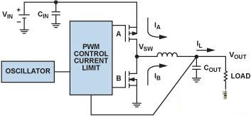 在圖 3 中,開關(guān) A 和開關(guān) B 分別利用 PFET 和 NFET 開關(guān)實(shí)現(xiàn),構(gòu)成一個(gè)同步降壓調(diào)節(jié)器。“同步”一詞表示將一個(gè) FET 用作低端開關(guān)。用肖特基二極管代替低端開關(guān)的降壓調(diào)節(jié)器稱為“異步”(或非同步)型。處理低功率時(shí),同步降壓調(diào)節(jié)器更有效,因?yàn)?FET 的壓降低于肖特基二極管。然而,當(dāng)電感電流達(dá)到 0 時(shí),如果底部 FET 未釋放,同步轉(zhuǎn)換器的輕載效率會(huì)降低,而且額外的控制電路會(huì)提高 IC 的復(fù)雜性和成本。
