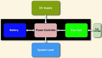 上述系統(tǒng)在使用的不同階段,能夠用做三種能源和兩種負(fù)載。當(dāng)該系統(tǒng)沒有插接直流電源時,燃料電池和/或蓄電池的組合結(jié)構(gòu)能夠為系統(tǒng)負(fù)載供電。另外,當(dāng)直流電源不存在時,燃料電池還能夠?qū)π铍姵剡M(jìn)行充電,以盡可能地增強電源斷電末期(end-of-power-shutdown)的性能,或者實現(xiàn)更好的系統(tǒng)動態(tài)電源響應(yīng)特性。當(dāng)直流電源可用時,它既對蓄電池進(jìn)行充電也對系統(tǒng)負(fù)載進(jìn)行供電。